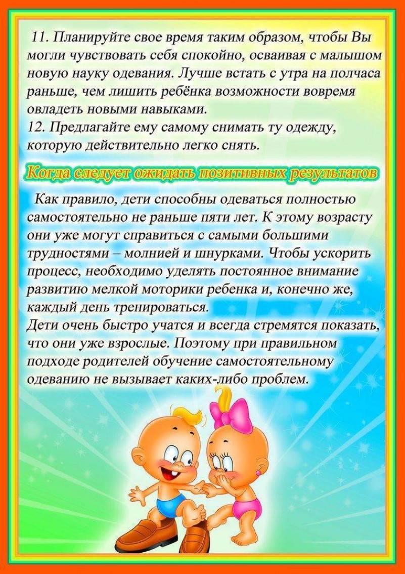 Однако нельзя и категорически требовать, чтобы малыш надевал все сам. Он многое не умеет, помощь взрослых ему необходима. Попробуйте стимулировать самостоятельность, говоря, что взрослые мальчики или девочки умеют одеваться.