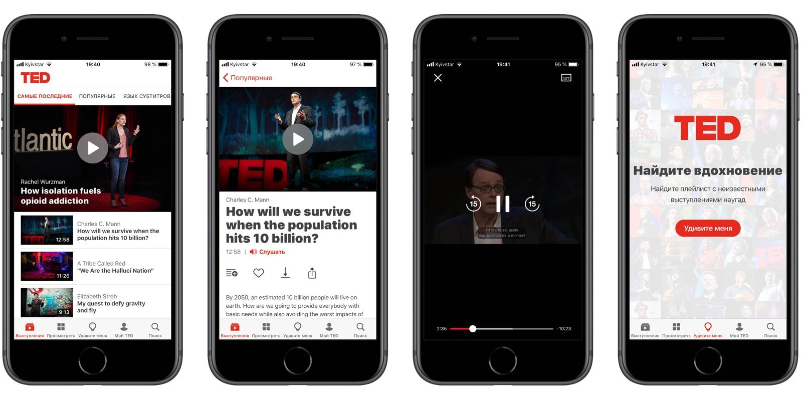 Приложение предоставляет доступ ко всей библиотеке официальных блогов студии TED. Студенты могут просматривать избранные выпуски, плейлисты понравившихся учёных и открывать беседы практически по любой интересующей теме. Портал объединяет миллионы учёных и гуманитариев всего мира, предлагая делиться ценной информацией напрямую с тем пользователем, который в ней нуждается.