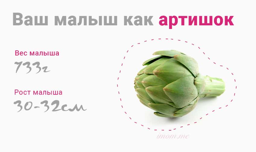 С наступлением 24 недели беременности, размер малыша можно сопоставить с артишоком. Рост крохи составляет 30-32 см. Вес достигает 733 грамма. Несмотря на свою значительную прибавку в росте и весе, малыш пока комфортно двигается. Ему хватает пространства, чтобы крутиться и переворачиваться. Когда беременность перешла в стадию 24 недели, ребенок начинает расти еще быстрее. Это обусловлено активной выработкой соматотропина — гормона роста. В этот период уровень гормона у малыша даже выше, чем у взрослого человека.