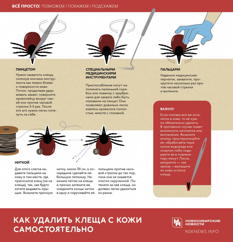При этом очень важно, чтобы его головка не осталась под кожей. Если не удалось вытащить всего клеща сразу, можно воспользоваться продезинфицированной иголкой (извлечь как занозу) или обратиться в больницу.