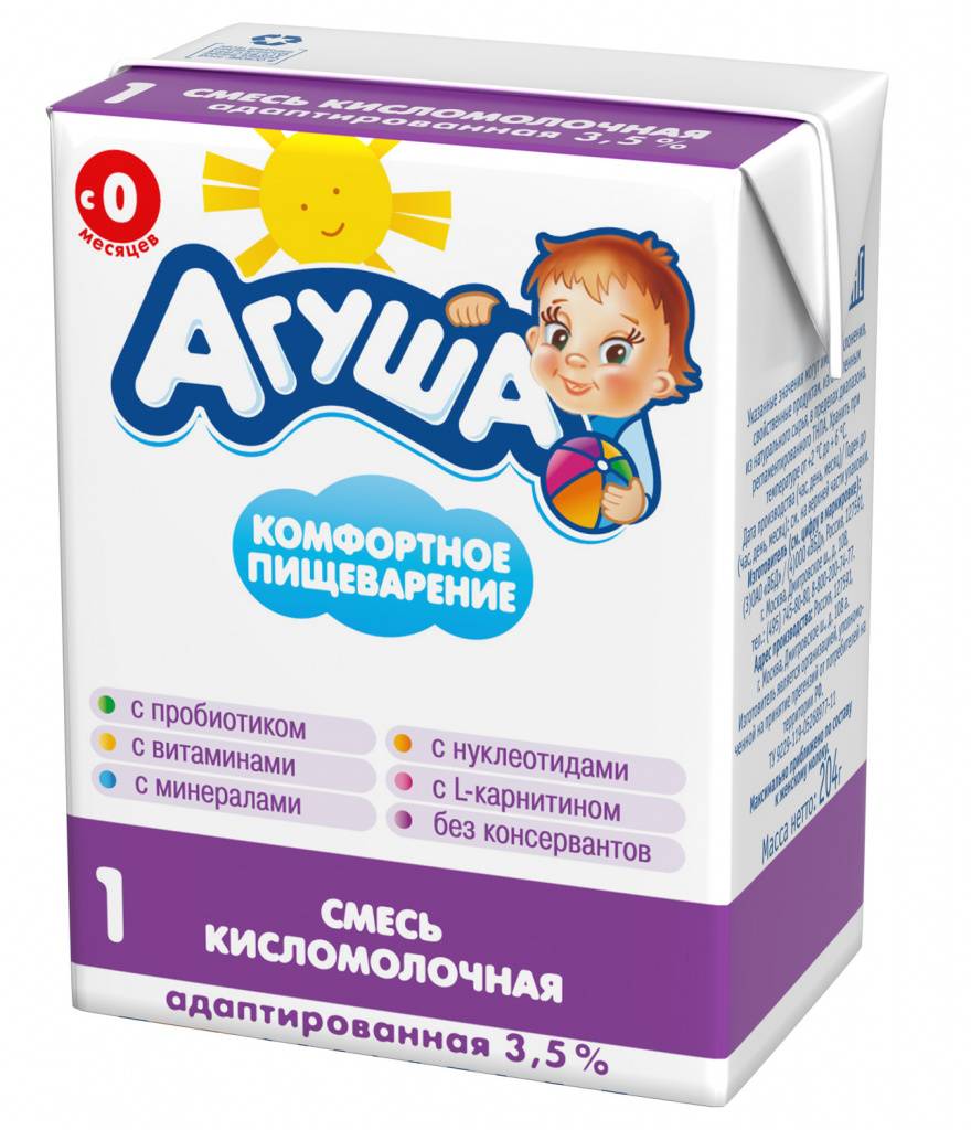 Жидкая смесь Агуша кисломолочная адаптированная №1 рекомендована для питания младенцев с рождения до 6 месяцев при искусственном и смешанном вскармливании. Она создана на основе частично гидролизованных белков, обогащенная пробиотическими культурами, L-карнитином и нуклеотидами. Продукт не содержит консервантов.