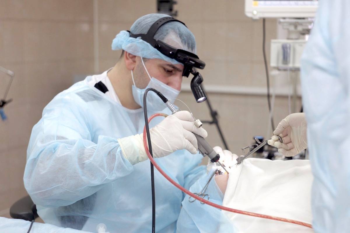 На фото ведущий врач клиники Оганесян Тигран Сергеевич с помощью шейвера проводит манипуляцию в рамках операции по удалению аденоидов у ребенка под общим наркозом комбинированным методом.