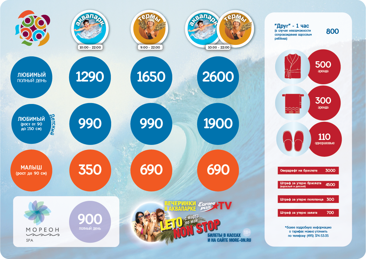 Цены в аквапарке «Мореон» более чем приемлемые, малыши ростом до 110 см. проходят по бесплатному билету.