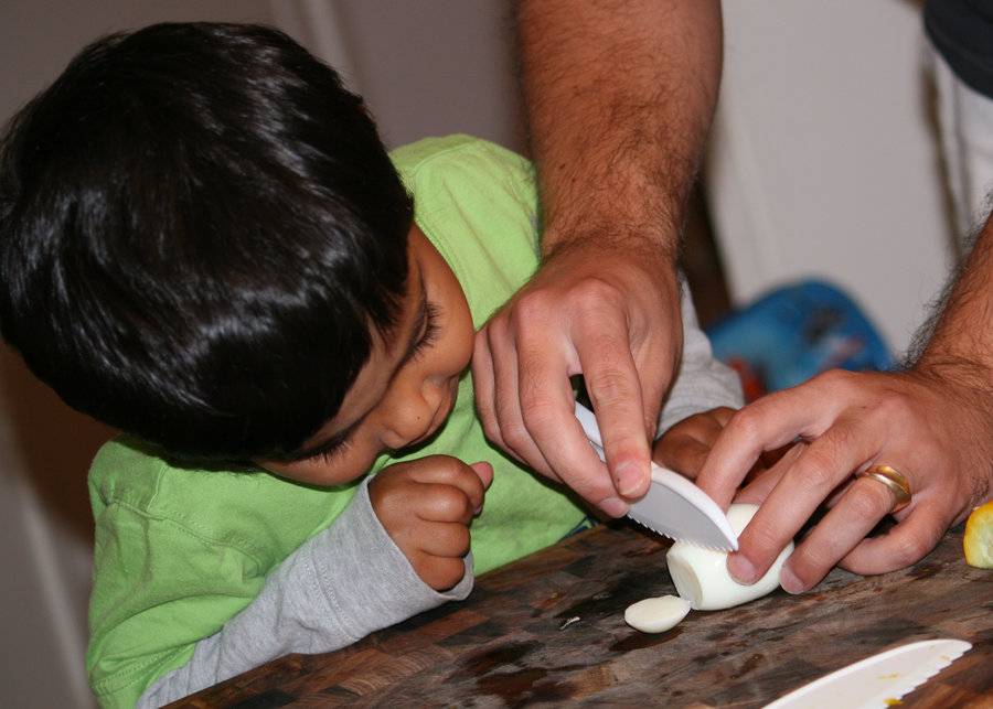 Многих волнует вопрос – когда можно разрешить пользовался ножом? На самом деле довольно рано. Под присмотром мамы даже дети 3-4 лет способны нарезать что-то простое. А порезать банан пластиковым ножом способен и двухлетка.