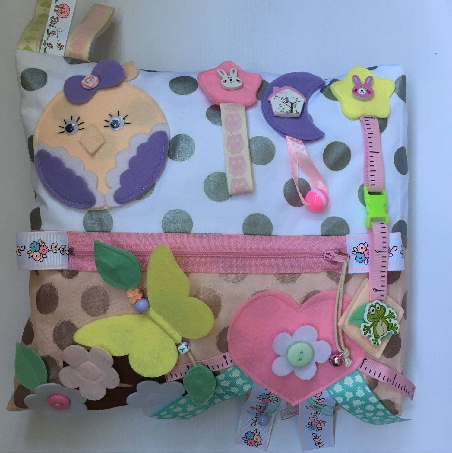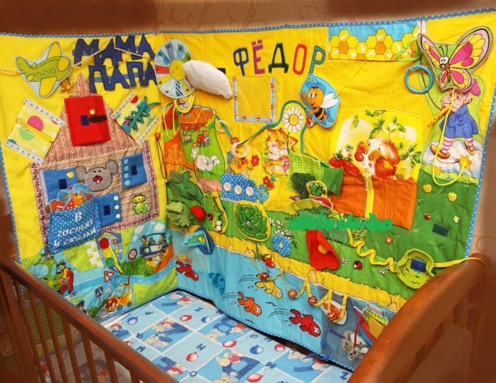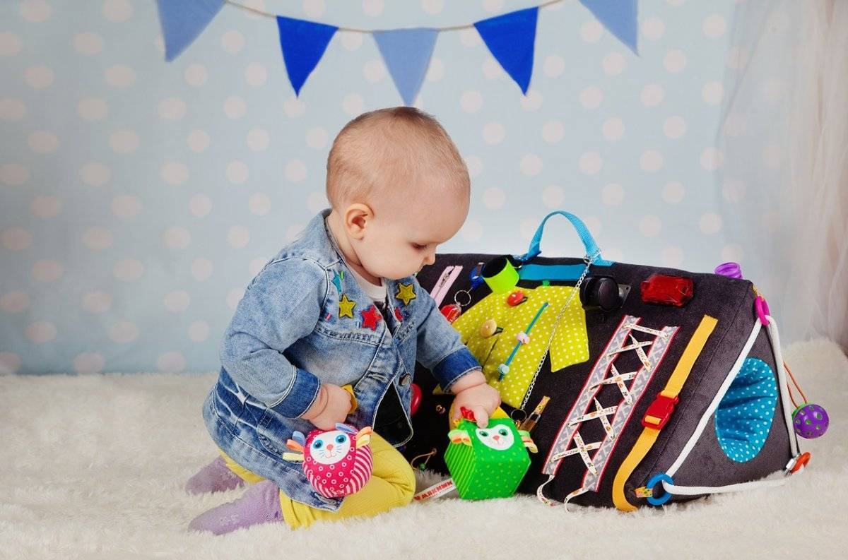 Напомним, что для детей до года стоит выбирать мягкие бизиборды. Это могут быть большие полотна, мягкие кубики, подушки, книжки и многое другое. Самое главное, чтобы все предметы были надежно закреплены, и ребенок не смог ничего оторвать и проглотить.
