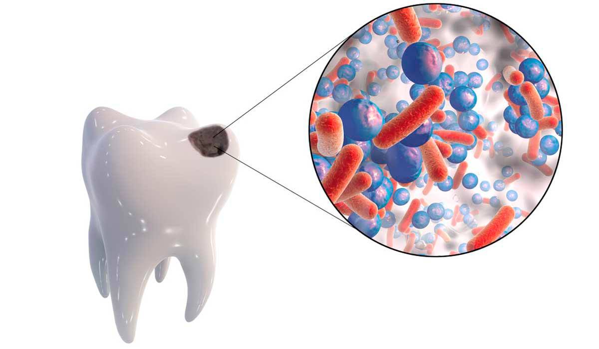 Кариес у всех людей, независимо от возраста, развивается из-за активного размножения в полости рта кариесогенных бактерий. Они перерабатывают сахарозу, содержащуюся в продуктах, и выделяют вредные кислоты, которые разъедают эмаль, вымывая из нее кальций и фтор. Вследствие деминерализации она становится рыхлой и пористой, а потому постепенно разрушается и обнажает внутренние ткани зуба — дентин.