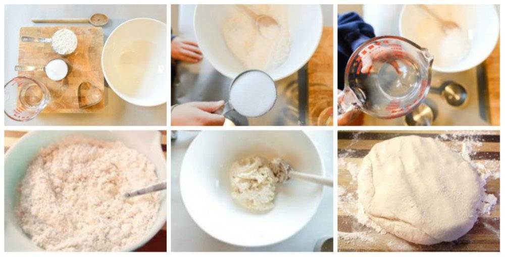 В глубокой миске следует перемешать соль и муку так, чтобы компоненты стали гомогенной смесью. Затем добавить немного воды, чтобы сухие компоненты схватились и влить масло. После этого вымешивать тесто до получения эластичного комка.