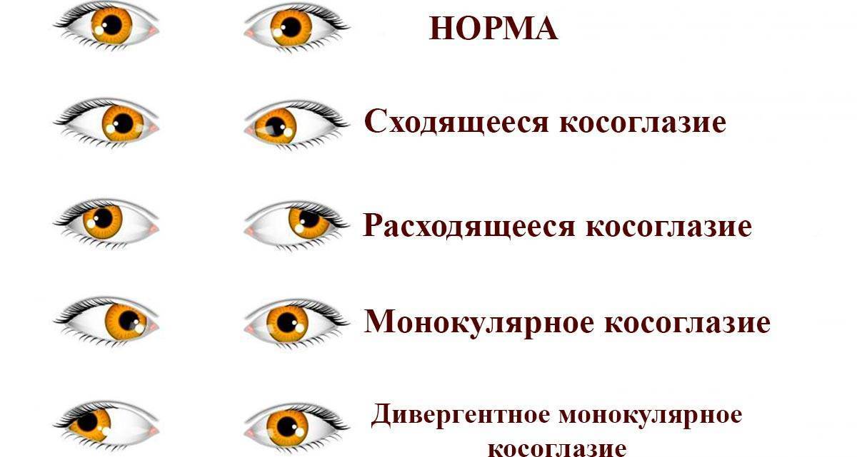 горизонтальное косоглазие — глазки могут сходиться к переносице или наоборот, расходиться, тяготея к височной зоне;