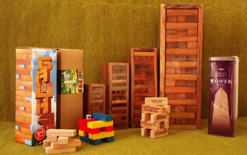 Интересная игра для всей семьи, знакомая многим поколениям. Правила простые – сначала нужно построить башню, кладя по 3 бруска на уровень (на каждом этаже направление деревяшек меняется). Далее самое интересное – участники по очереди достают бруски из любого этажа и кладут их на новый ярус здания. Проиграет человек, после хода которого башня рухнет.