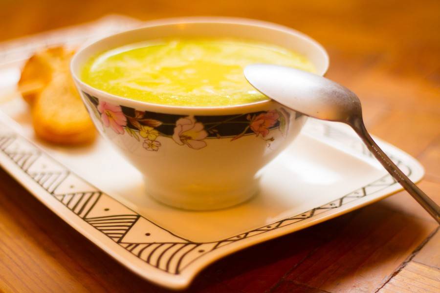 - Все ингредиенты измельчают в блендере. Полученную смесь разбавляют овощным бульоном и доводят до кипения на печке.