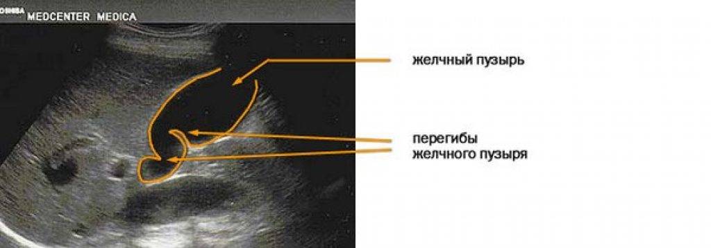 - Появление перегиба, возникающего между дном и телом желчного пузыря.