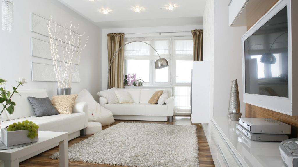 Чтобы зрительно увеличить тесную комнату, ее нужно оформить в светлой цветовой гамме. Особенно важны светлые стены и пол в случае, если между двумя зонами стоит какая-либо перегородка, крадущая дневной свет в гостиной. Кроме того, на белом фоне беспорядок, скажем, из раскиданных игрушек выглядит не так уж критично.