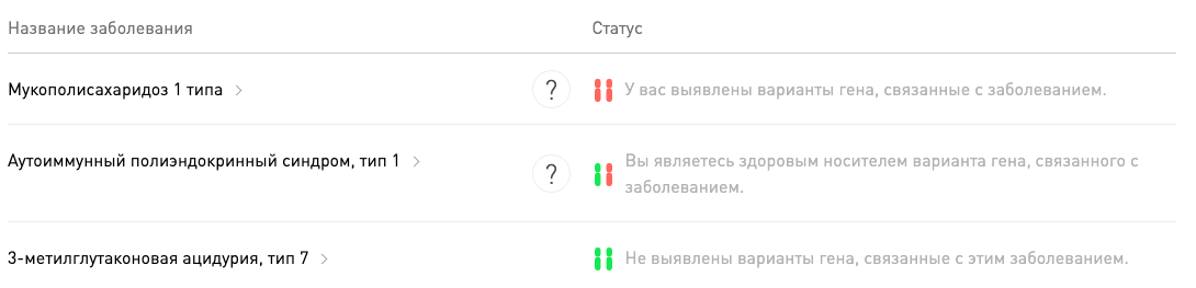 Выявлены варианты гена, связанные с заболеваниемДве красные хромосомы. Вы увидите рядом с названием знак вопроса. Нажмите на вопрос, чтобы ознакомиться с более подробной информацией.
