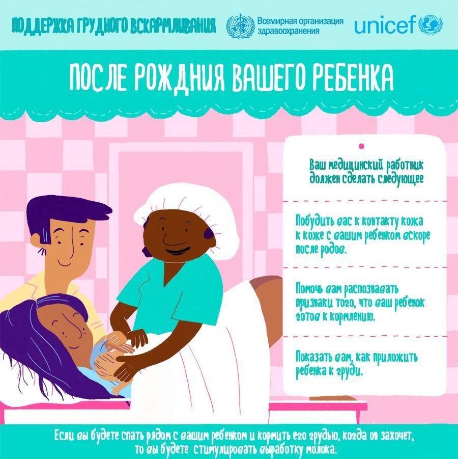 - Медицинский персонал должен способствовать налаживанию грудного вскармливания в течение первого получаса после рождения ребенка. Если кроха здоров и его жизни ничто не угрожает, то первое прикладывание к груди должно произойти уже в родильном зале.