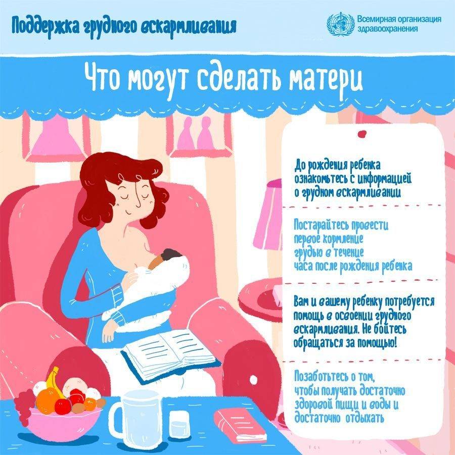 ВОЗ рекомендует всем медицинским учреждениям, связанным с деторождением, обеспечить должные условия и комфортное пребывание там будущих мам, чтобы благоприятно повлиять на становление лактации и улучшить процесс выработки молока в первое время с момента рождения младенца. Это позволит молодой маме настроиться на нужный лад, быстрее привыкнуть к новым условиям и не переживать по поводу организации процесса кормления.