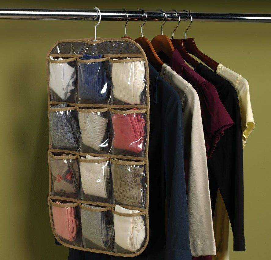 - Изготовленные самостоятельно подвесные системы хранения с кармашками из прозрачной пленки позволят хранить носки, трусы, ремни, платки, шапки, обувь, мелкие предметы. Вещи всегда будут на виду, и доставать их очень удобно.