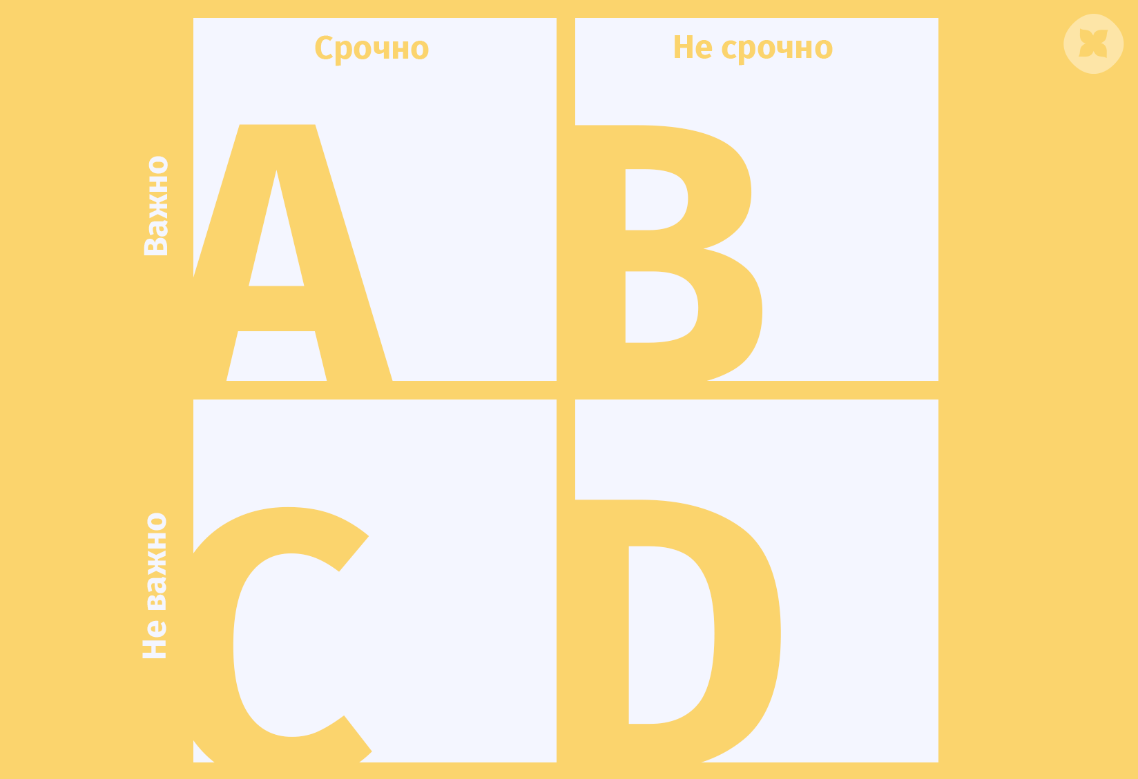 Подразумевает разделение дел по 4 квадратами – A, B, C, D. В квадрат «А» записываются срочные и важные дела. В идеале, этот квадрат должен оставаться пустым, поскольку при грамотном планировании такие дела выполняются в квадрате «B». В нем нужно описывать важные и несрочные дела.