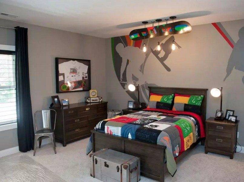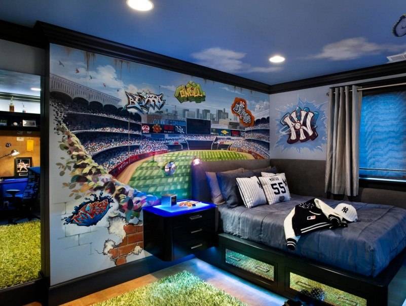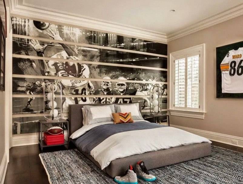 Интересным будет дизайн, основанный на увлечениях, интересах, способностях подростка. Сегодня распространен тематический дизайн подростковых комнат. Для любителей спорта это может быть футбольная, баскетбольная тематика на стенах и в мебели. Производители предлагают мебель с разными спортивными принтами, на заказ выполнят кровать и шкаф любых размеров и форм. На стене можно разместить импровизированные футбольные ворота или фотографии великих игроков. Любителю бокса повесить «грушу» для тренировок. Если ребенок делает успехи в спорте, обязательно выделите полку для его победных трофеев. Медали и кубки – гордость любого мальчишки.