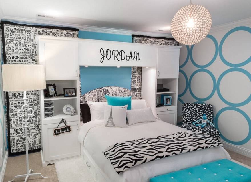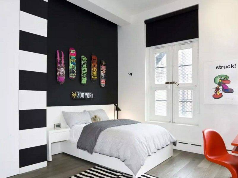 Для интерьера подростка классическим дизайнерским решением считается использование контрастной черно-белой комбинации с одним ярким акцентом.