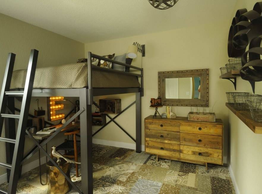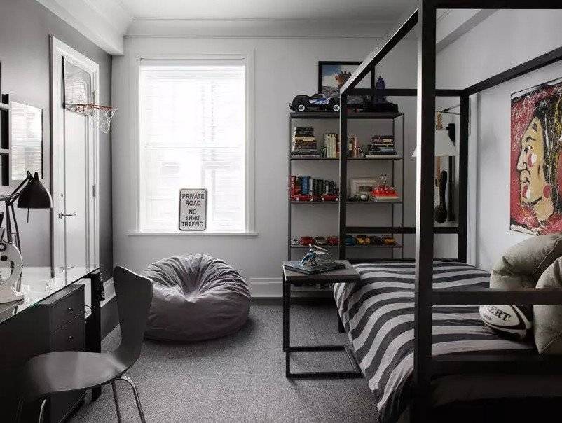 - Лофт. Эта стилистика подчеркнет непредсказуемость характера сына. В нем необходимо сочетать то, что кажется несовместимым. Например, строгость форм корпусной мебели и мягкий, комфортный диван.