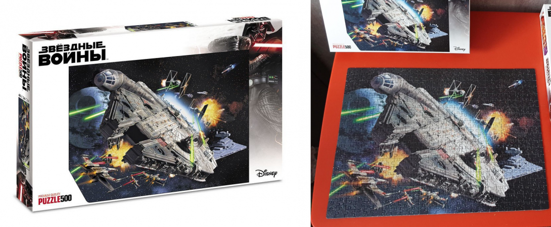 Пазл «Звездные войны», 304 рубля. Пазл с сюжетом из Звездных войн на 500 элементов. С помощью взрослых можно собрать за один день, без — за два-три. Если склеить собранный пазл скотчем с внутренней стороны, получится картина для украшения детской.