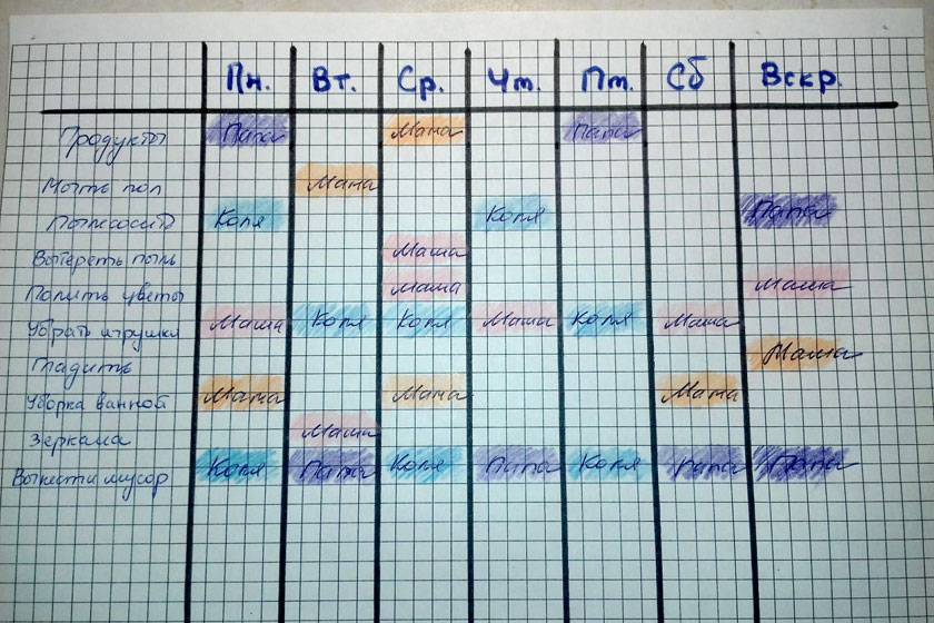 Пусть в строчках таблицы будет список регулярных дел, а в столбиках — дни недели. На пересечении вносим ответственного. Например, папа ходит в магазин по понедельникам и пятницам, а мама — по средам. Дочка поливает цветы по четвергам, а сын пылесосит квартиру по субботам. Распределить обязанности лучше на семейном совете.