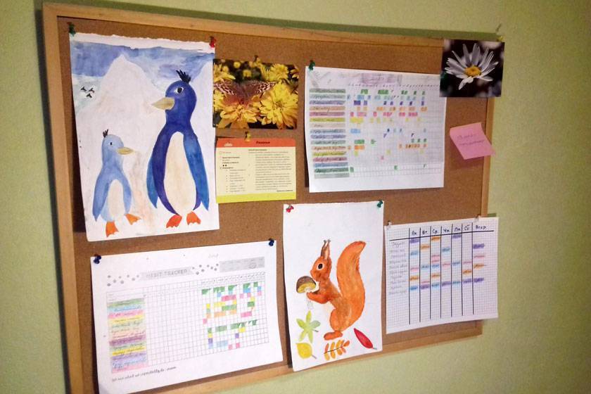 Чтобы расписания, таблицы, списки важных дел и развлечений были на виду, Ю-мамы рекомендуют повесить дома пробковую или маркерную магнитную доску. На таких досках легко менять информацию. Их можно украсить семейными фотографиями, детскими рисунками и аппликациями.