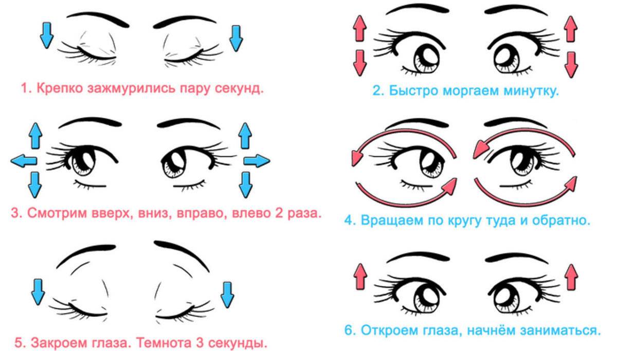 - Чтобы улучшить кровообращение и расслабить мышцы. Исходное положение — сидя, спина ровная. Сильно зажмурьтесь на 5 секунд, после — быстро откройте глаза также на 5 секунд. Повторите 8 раз.