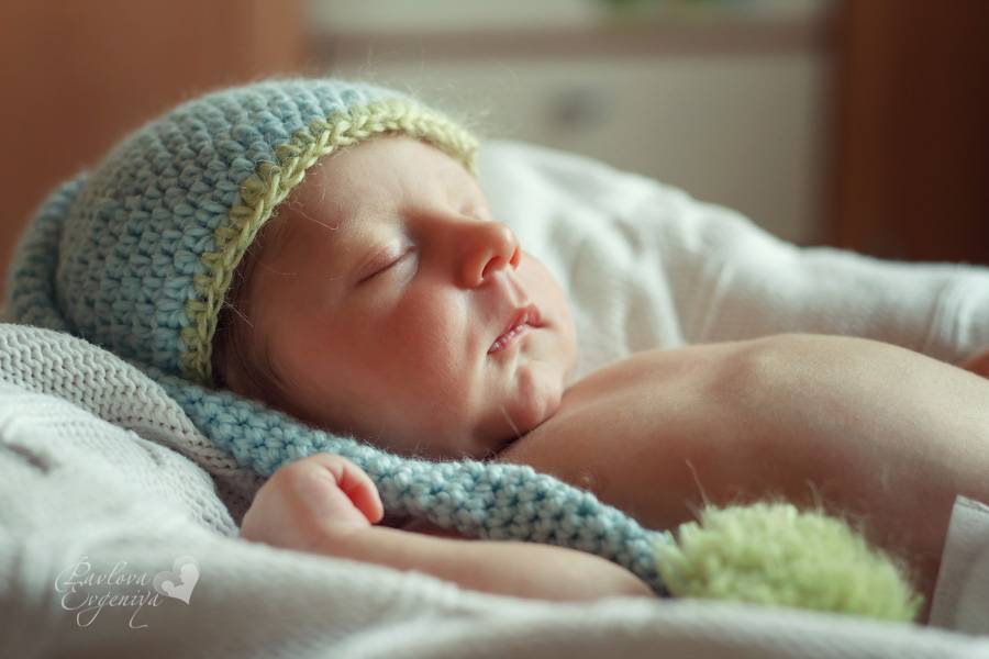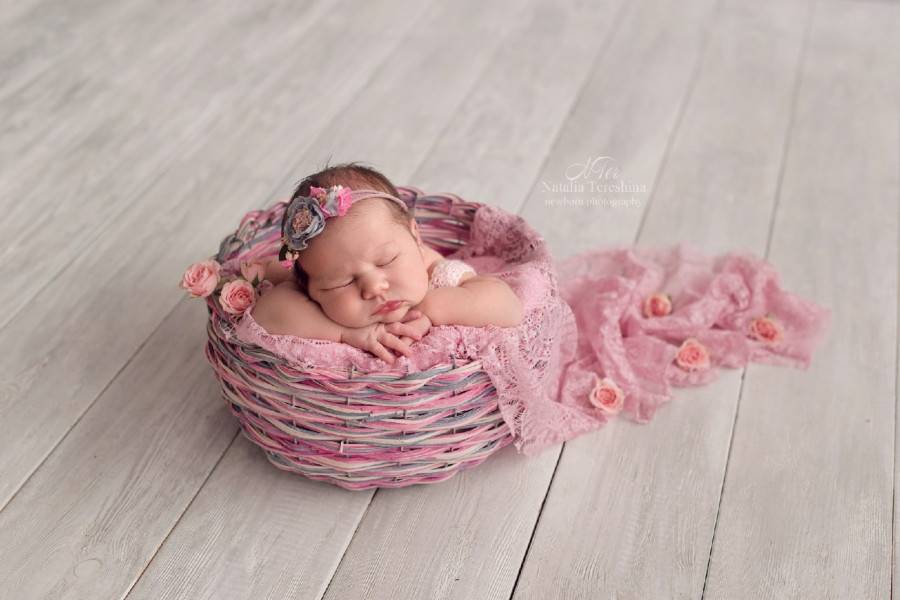 В первые недели жизни детки спят большую часть суток. Это нормальное явление и оно не должно быть для Вас препятствием. Напротив – кадры спящего малыша могут быть забавными и очень трогательными. Снимки свернувшихся калачиком спящих младенцев сейчас в тренде. Иногда их укладывают в корзинки для новорожденных, наряжают в яркие пелёнки и распашонки, украшают симпатичными бантиками и цветочками. Идеальный возраст для таких снимков 2-3 недели. Именно в это время младенцы очень крепко спят. Позже положить его в такую позу для съёмки у Вас вряд ли получится.