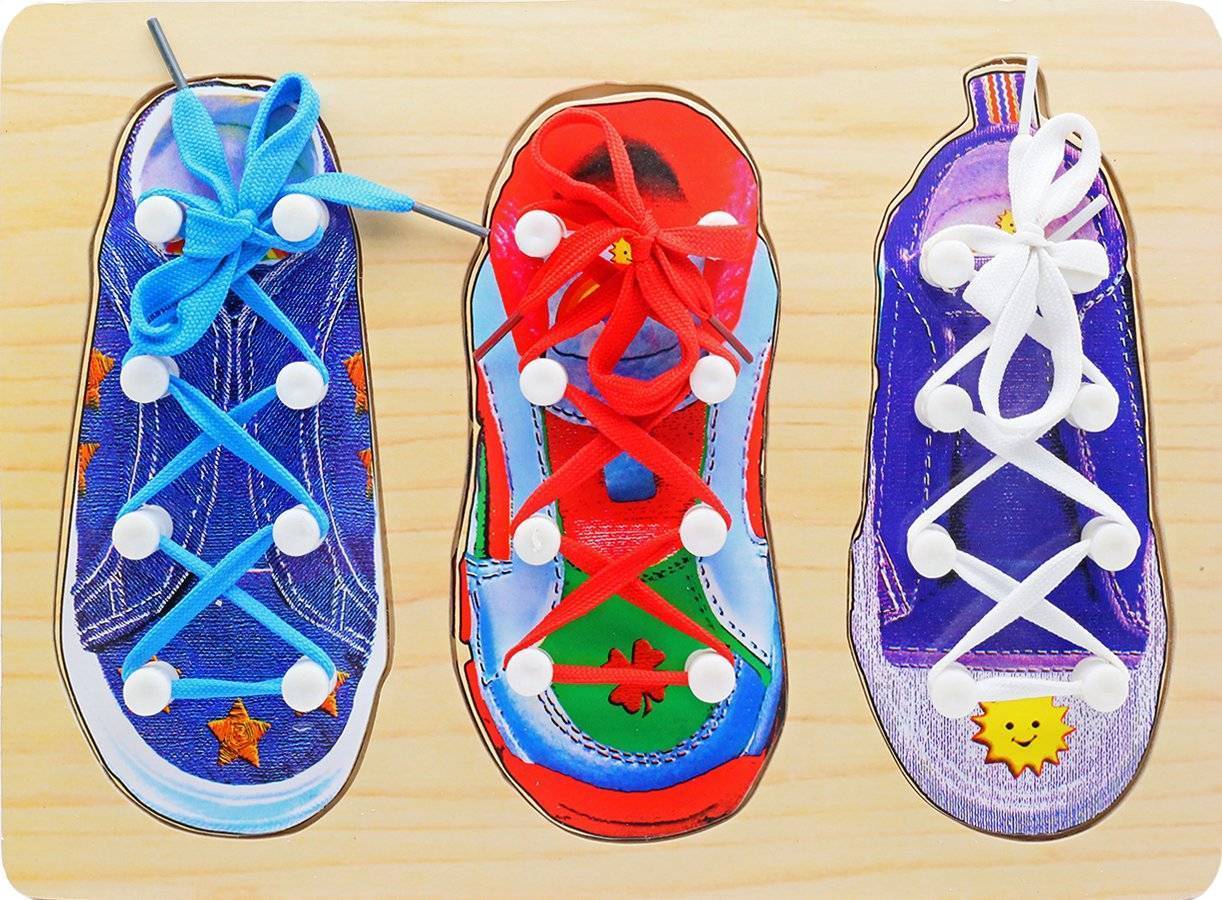 Знакомство с липучками можно начинать уже с полуторогодовалого возраста. Если у вашего карапуза это легко получается, то можете переходить к шнуркам.