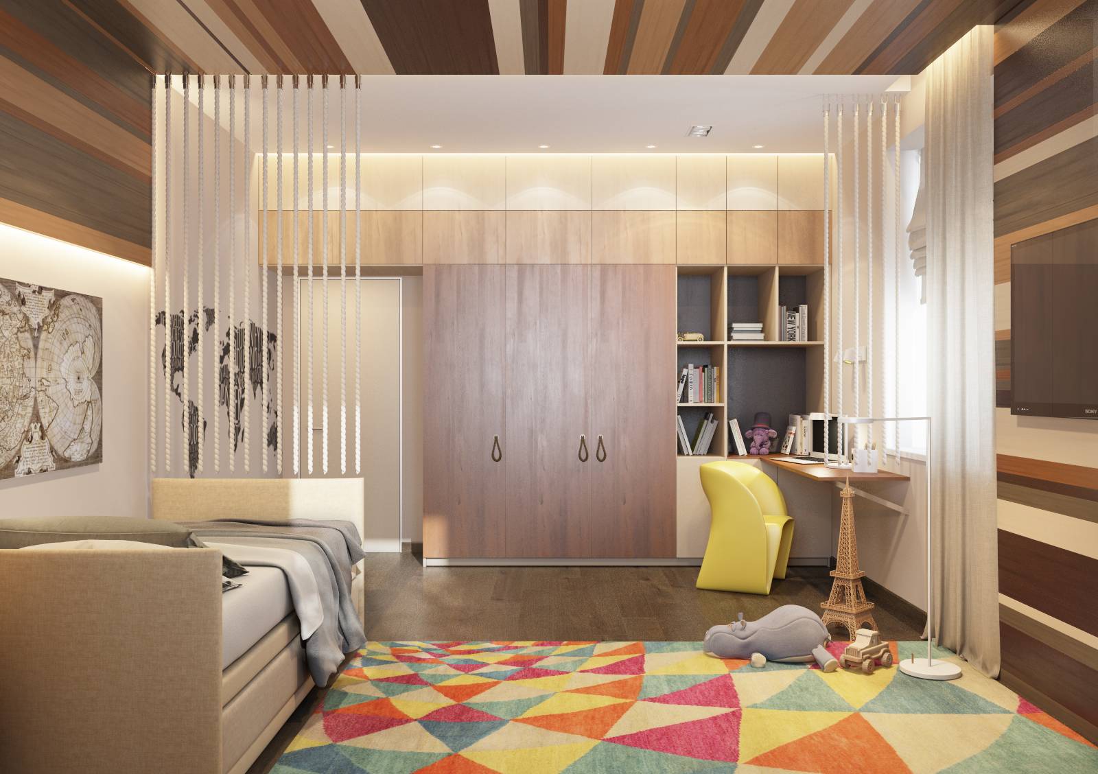 Будет ли это легкая полупрозрачная занавеска или плотная портьера — зависит от возраста и предпочтений проживающих. Если малыш ещё совсем маленький, то его кроватку можно поставить за воздушной занавеской, которая придаст помещению легкости. Ну а при наличии подросшего ребёнка для разделения стоит выбирать все же портьеры из плотного материала.