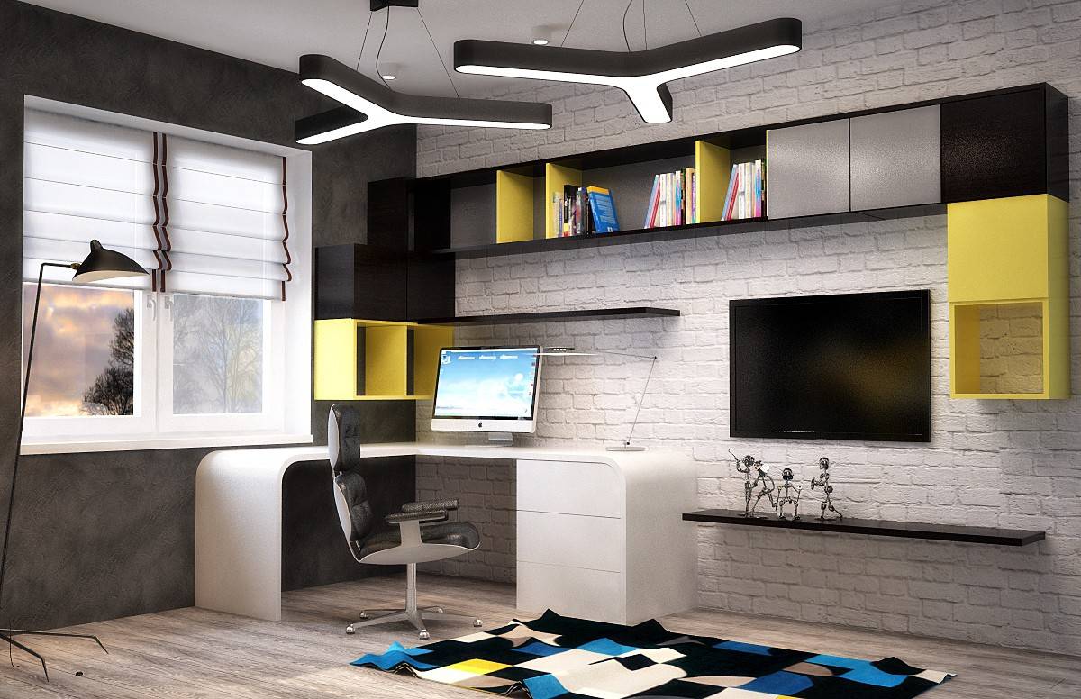 На фото интерьер комнаты для ученика, где по периметру потолка вместо люстры расположены споты.