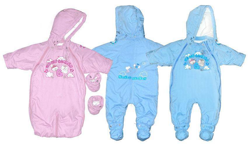 - Тёплый комбинезон или конверт на подкладке с варежками, чтобы защитить руки младенца от холода.