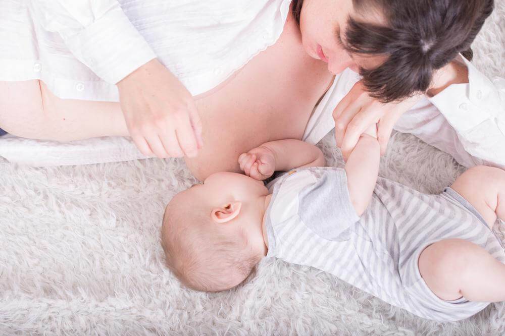 В идеале нужно кормить ребенка в позе «живот к животу» — мама и малыш должны лежать на боку, друг к другу лицом. При этом мама поддерживает ребенка за спинку или ягодицы.