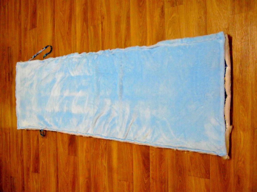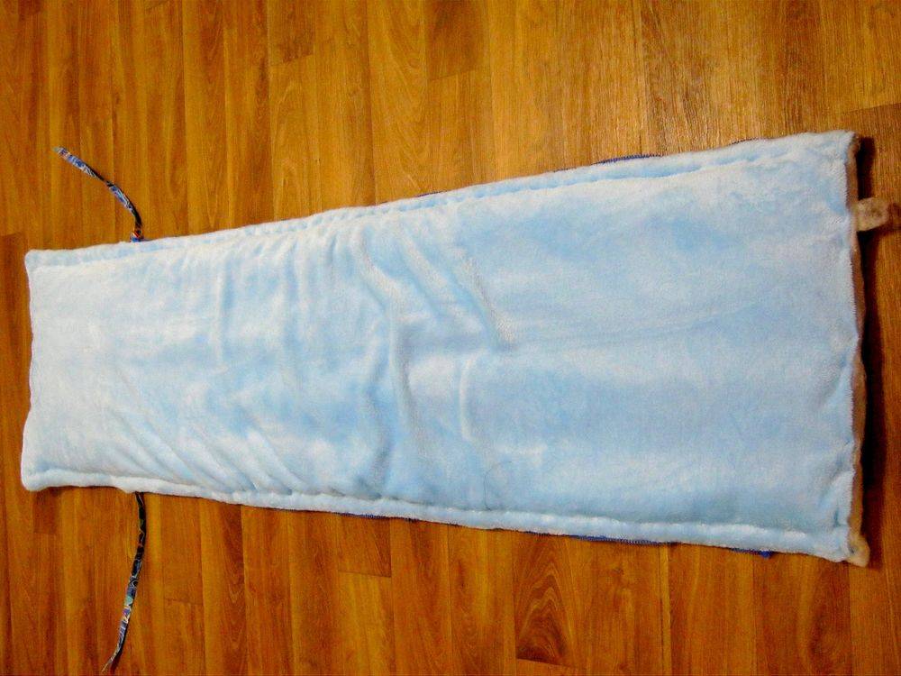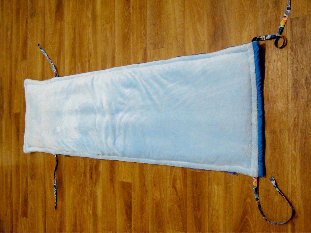 Можно не усложнять себе работу и вместо молнии пришить завязки из лент. Если малыша планируют заворачивать на уголок, то и атласные ленты пришивают изнутри, ближе к краям. При пеленании один угол накладывается на другой и завязывается лентами. Ребенок окажется в уютном и надежном коконе, надежно закрепленный завязками.