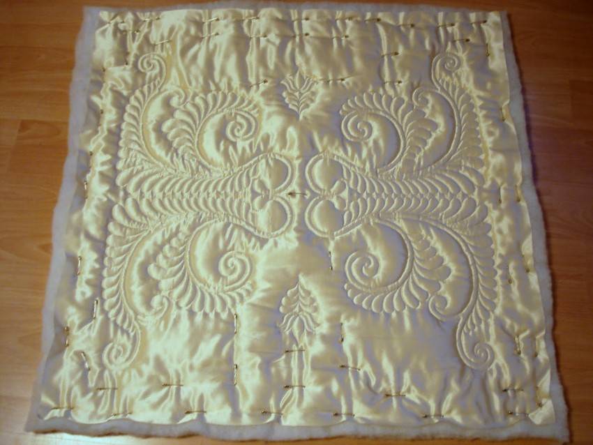 - соединить две части заготовки-прямоугольники, вложить внутрь нужное количество слоев утеплителя и сшить