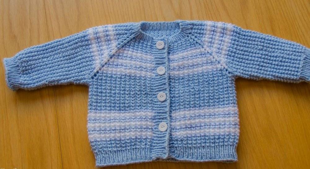 - фасон кофты может быть любой. Вы можете выбрать для себя простую лицевую гладь или платочную вязку. Для тех, кто уверен в своих силах, предпочтительнее взять трудоемкий ажурный узор. Самой популярной техникой вязания для новорожденных является реглан сверху. Он будет актуален даже для малыша с первых дней жизни;