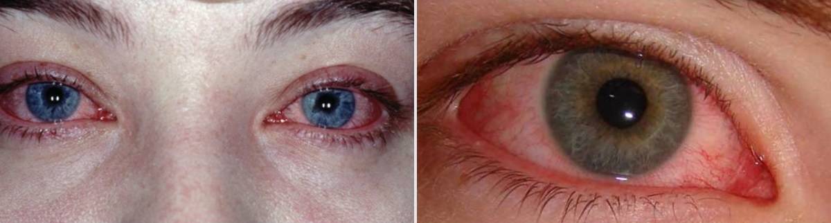 Аллергическое воспаление слизистых глаз. Симптомы аллергического конъюнктивита– сильное покраснение конъюнктивы, обильное слезотечение, выраженная отечность тканей. Без лечения может из острой формы перейти в хроническую – тогда к водянистым выделениям могут присоединиться гнойные.