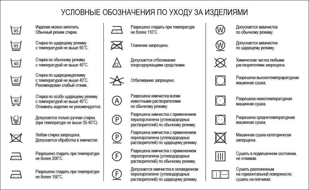 Каждая вещь содержит на своем ярлыке свой набор условных обозначений по уходу. Таких знаком большое количество, приведем наиболее распространенные: