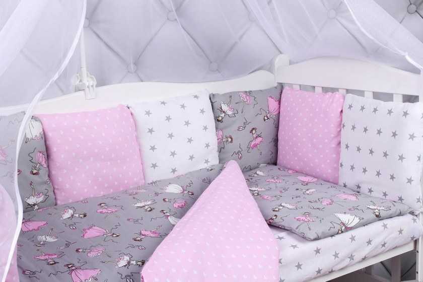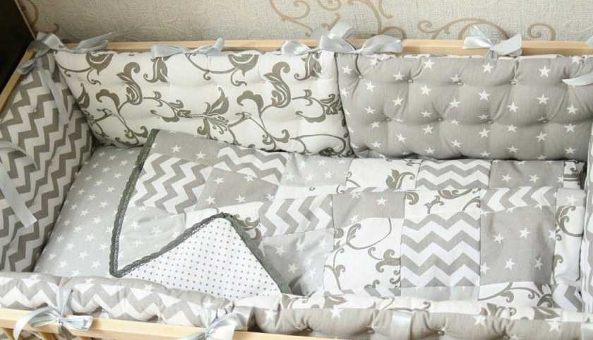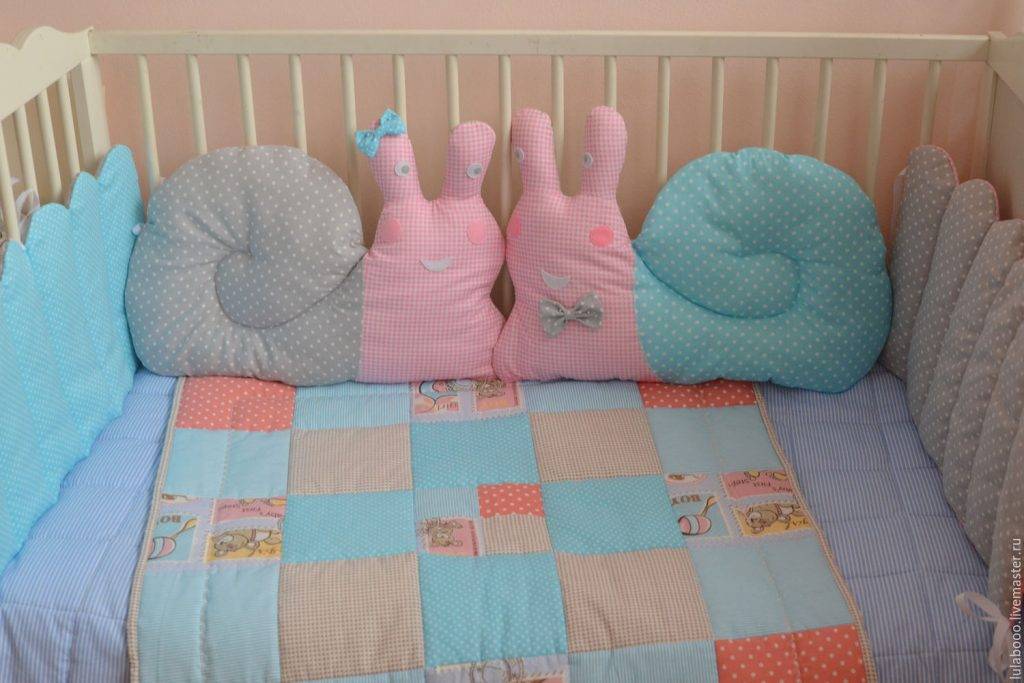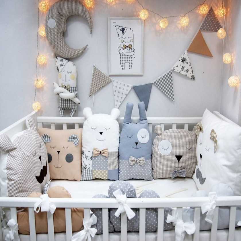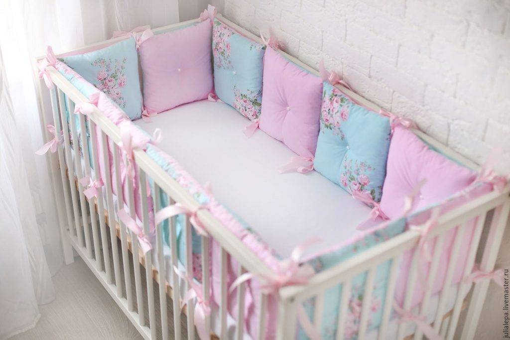 Задание станет еще проще, если бампер сделать из небольших подушек с завязками для крепления к стенкам кровати. Гармоничное сочетание нескольких оттенков и милый узор в виде зверушек, птиц или цветов наверняка заинтересует ребенка