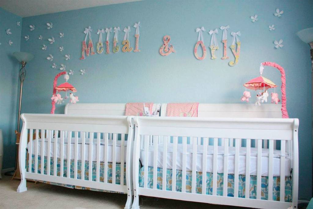 Самый удобный вариант и для близнецов, и для родителей — поставить кроватки рядом, но на небольшом расстоянии друг от друга. Близнецы видят друг друга, но при этом не соприкасаются. Родителям удобно стоять рядом во время укладывания детей, имея возможность покачивать обоих.