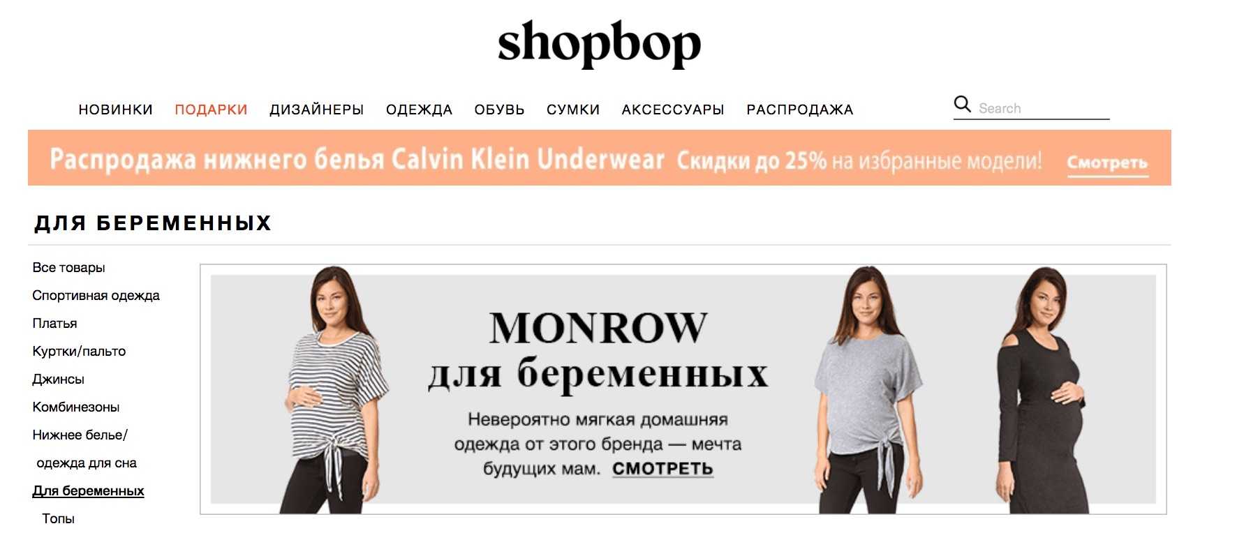 - — для модных мам здесь представлены прекрасные модели среднего ценового сегмента. Тут много классных джинсов с посадкой под животиком и красивого кружевного белья для беременных, которое не так уж и просто найти. Доставка в Россию очень быстрая, доставляют DHL.