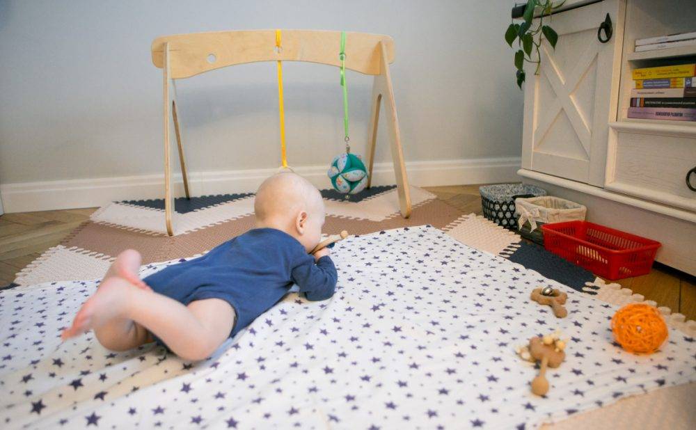 Так может выглядеть развивающее пространство ребёнка до года — до игрушек легко дотянуться и их немного