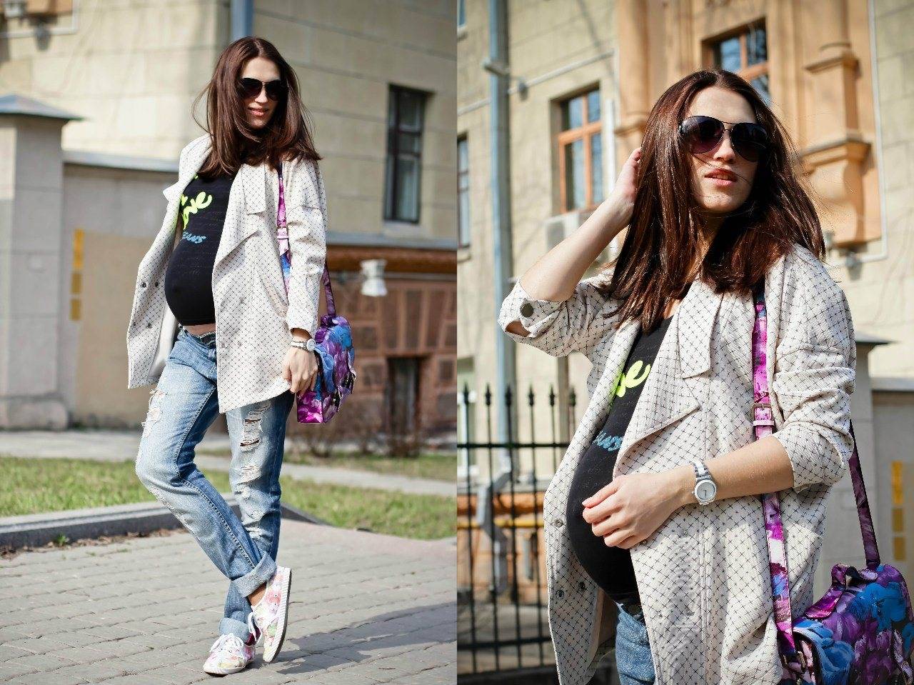 Многие девушки и молодые женщины очень любят джинсовую одежду. Во время беременности от джинсового стиля совсем не нужно отказываться, так как эта одежда удобна, изготовлена из натуральных материалов и к тому же позволяет даме выглядеть стильно и привлекательно. Следует избегать только узких обтягивающих джинсовых брюк, сдавливающих живот, желательно выбрать джинсы более свободные. Лучше всего, чтобы они держались не на талии, а на бедрах и не сдавливали будущего младенца в материнской утробе. Джинсы можно носить как с футболками, так и с блузками, джемперами, пиджаками и с джинсовыми рубашками, ветровками, куртками.