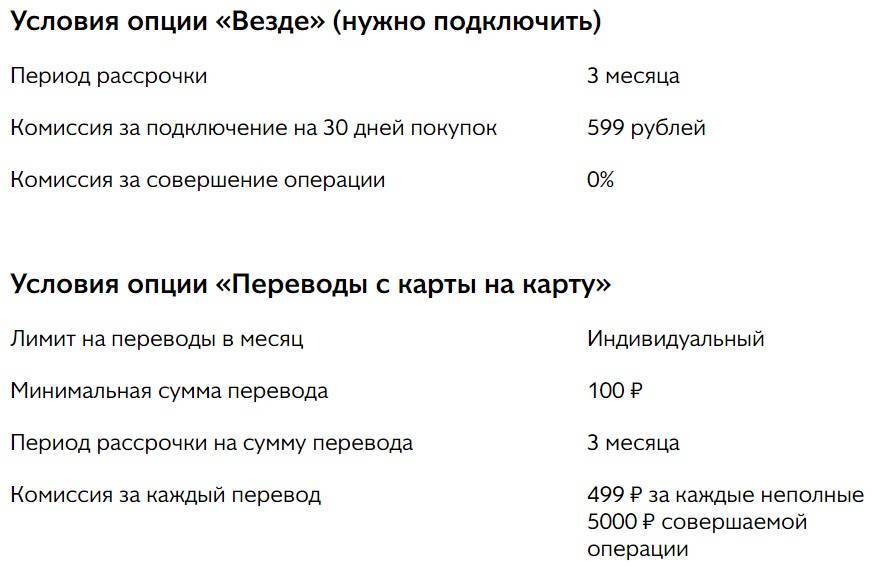 Комиссия за подключение на один месяц составляет 299 рублей, на десять месяцев — 1 999 рублей. Если рассрочка нужна только единоразово, то можно оформить опцию на одну покупку, это будет стоить 199 рублей.