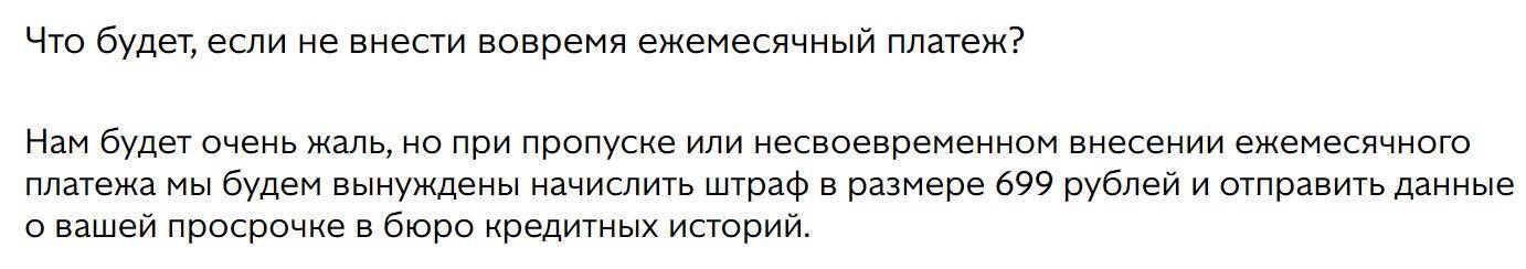 - Каждый пропуск очередного платежа в период рассрочки: разовый штраф — 290 рублей.