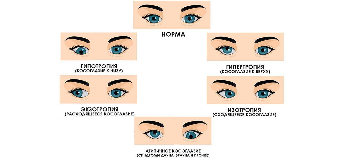 Болезнь внешне может проявляться по-разному. Исходя из траектории смещения зрительной оси, косоглазие делится на: