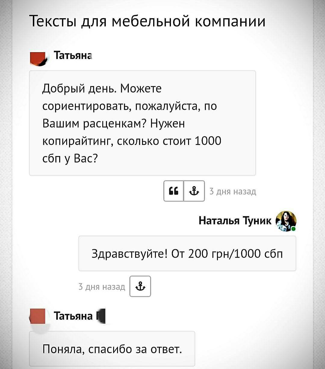 Прежде чем заработать первые деньги, я училась. Читала умные блоги известных копирайтеров: П. Панды, С. Трубадура, Д. Кота, Д. Каплунова, Ю Волкодав. У меня не было опыта. Я изучала опыт других и пыталась примерить его на себя, когда писала для клиентов тексты.