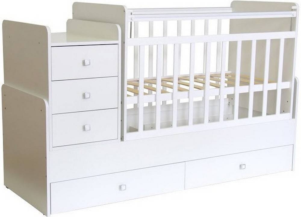 - Кровать-трансформер со встроенным боковым комодом, пеленальным столиком и ящиком внизу.