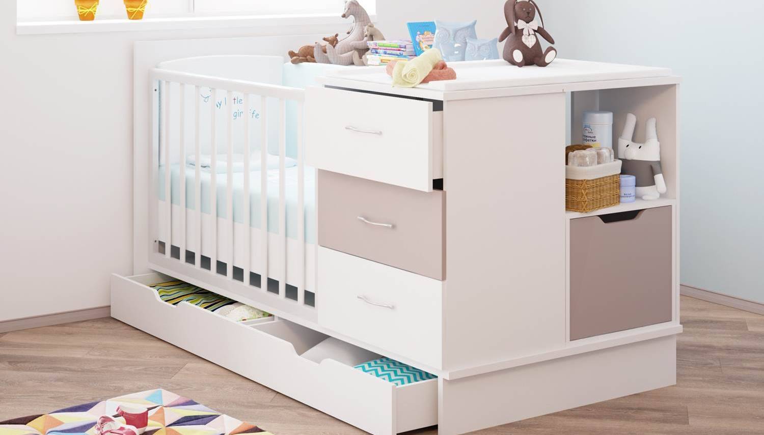 У некоторых моделей кроваток бывают комоды и пеленальные столики, что удобно для большинства родителей
